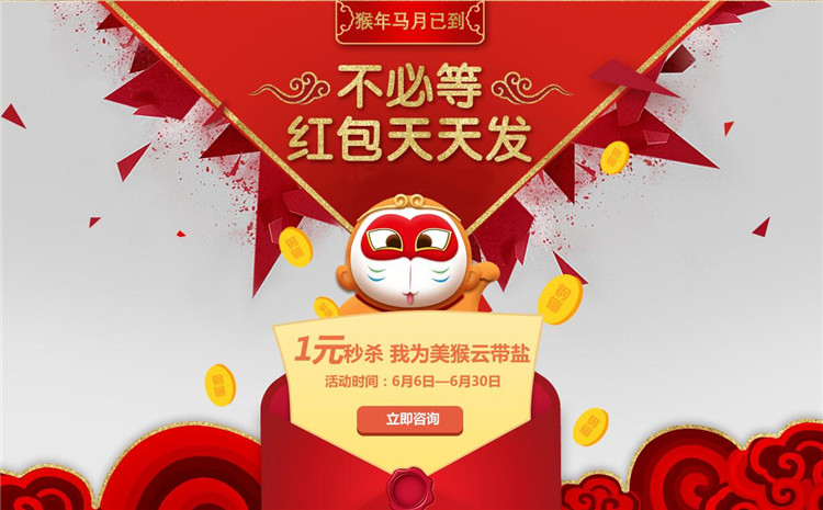 美猴云自2016年4月上线以来,向广大用户推出的优惠活动真的很多,5月份推出了5折上云优惠活动,6月份美猴云又带给我们新的惊喜,十二年一遇到的猴年马月终于到了美猴云平台精心策划推出1元秒杀优惠特权活动,更有福利红包天天送...