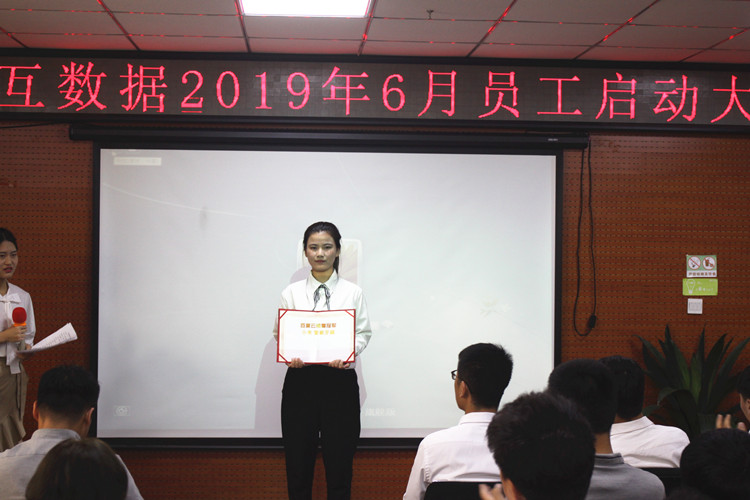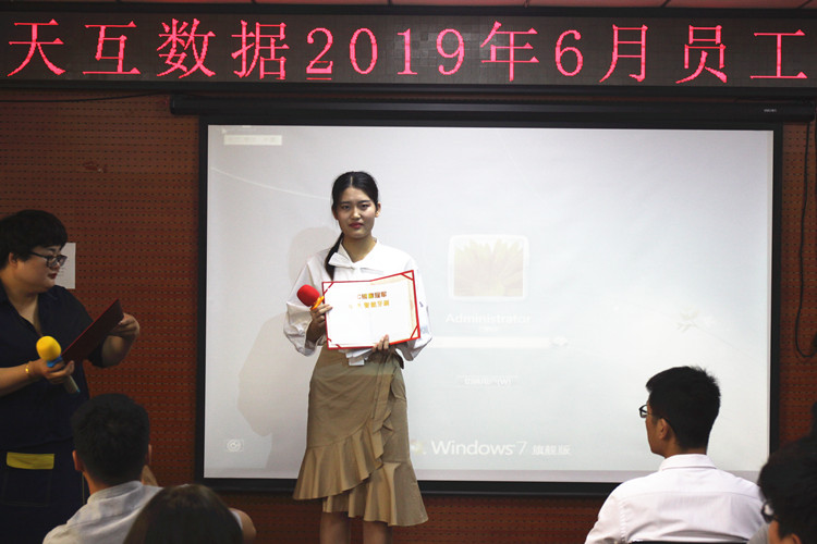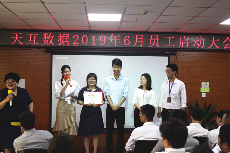 接下来主持人公布了5月销售冠军及团队人员名单,分别是张立文——IDC销售冠军、卜盼——百度云销售冠军、IDC三部——销售冠军团队,天互数据为销售冠军们颁发荣誉证书并每人一份神秘大礼,相信每一份付出都会有回报,也祝福优秀的天互家人们能在火热的6月,点燃激情,擦出业绩的火花!