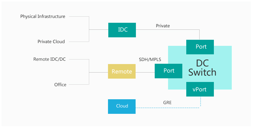 数据中心交换机帮助物理架构/专有云与公有云、远程数据中心或办公室,在数据中心中提供一条虚拟专线,实现混合架构的内部网络访问互通。