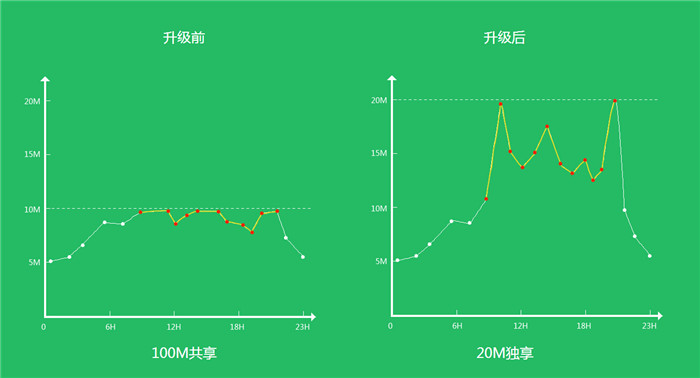 升级后20M独享:带宽相互独立,单台服务器保证至少20M独享纯带宽,真正的专属。打破了共享带宽的瓶颈,20M独享带宽,专属就是任性,想怎么用就怎么用。